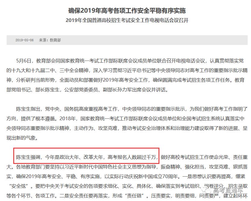 5月6日,教育部会同国家教育统一考试工作部际联席会议成员单位联合召开电视电话会议,全面动员和部署做好2019年高考安全工作。这一电话会议上,透露了一个重磅消息: “2019高考报名人数超过千万” (来源:教育部网站) 各省高考报名人数或持续上涨 。 河南:2019普通高校考试招生报名合计超100万。 江苏:2019普通高校考试招生报名合计48.4万人,其中普通高考报名33.9万人、中职及其他对口升学报名14.5万人。 北京:2019高考北京市共有59209人报名,其中,统考考生54065人,单考考生5144人。 江西:2019普通高考报名人数达42.1万人,比2018年增加3.9万人,是近几年来考生人数最多的一年。 广西:2019高考考生规模高达46万,较去年增幅6万余人,总报考人数再创历史新高。 山东暂未公布。 会议上还公布了什么? 今年高考报名人数超过千万,高考安全工作如何确保?刚刚,教育部会同国家教育统一考试工作部际联席会议成员单位开了一个重要会议。这个会议全国有5万余人参加,教育部党组书记、部长陈宝生,公安部党委委员、副部长孙力军出席会议并讲话。