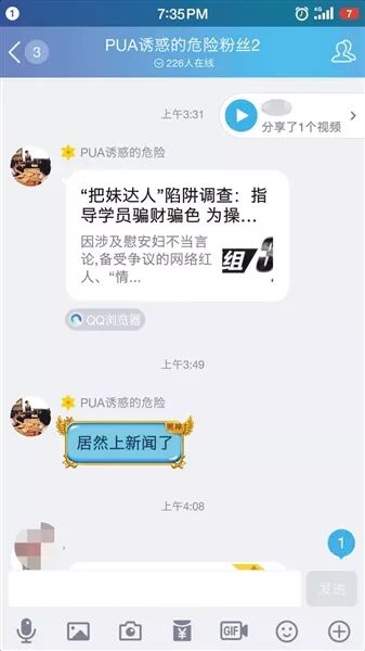 在报道PUA组织“享妞军团”教授学员骗财色后,其粉丝教学群均被腾讯永久封号。在封号前,该组织导师不仅在群内分享了报道链接,还称一切都是他导演的。