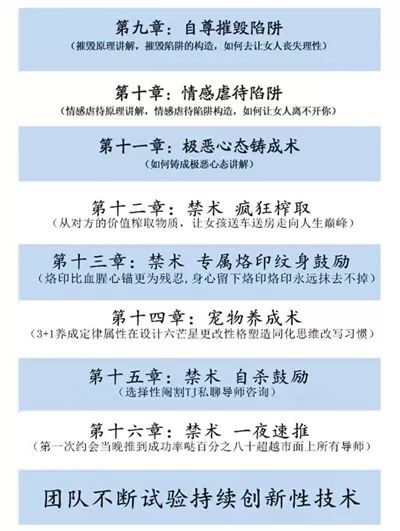 “防不良PUA就像防诈骗一样。”孔唯唯说,很多PUA都把自己包装为成功人士,朋友圈里展示豪车、豪宅,而这些都是虚假的,是用来骗取女性的手段。 “五步陷阱”目标除了情色还有钱 “诱惑”的课程全在网上进行,随着课程的深入,教学内容也开始讲授如何心理控制,指导学员如何让对方感情崩溃,失去理性。