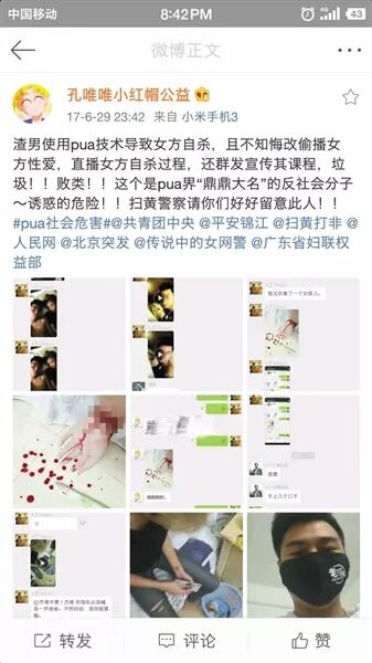 根据受害女性的讲述及自己的调查,自2017年6月起,孔唯唯曾三次在“小红帽”的微博上曝光过“享妞军团”直播女性自杀,偷录女性私密视频等。微博下方有数百条评论,有网友也评论“当前PUA市场太混乱,不断有女性深受其害”。